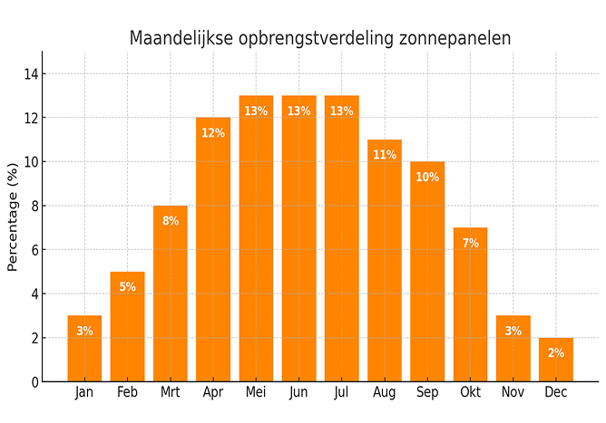 De opbrengst varieert per maand. Voor een nauwkeurige schatting gebruikt u de jaaropbrengst als basis en vermenigvuldigt u die met het percentage van de maand. Stel dat juni goed is voor 13% van de totale jaaropbrengst: